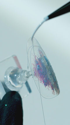 - Ota Jewel Paste Geliä siveltimeen ja lisää sitä kynnelle haluamiisi kohtiin. Jewel Paste Gel on todella paksua, jonka vuoksi sitä täytyy joskus "kaivaa" siveltimellä paletista. Koveta 60 s LED-lampulla tai 2 min UV-lampulla.