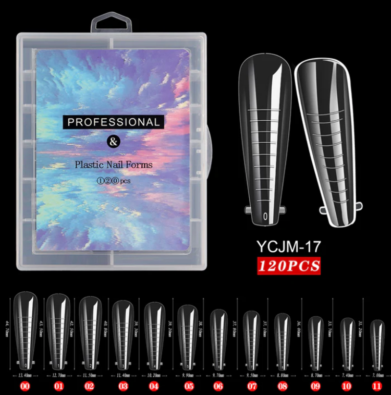 Dual Form tekee rakennekynsien tekemisestä akrygeelillä helpompaa ja nopeampaa! Laatikot sisältävät Dual Formeja 12:ssa eri koossa.