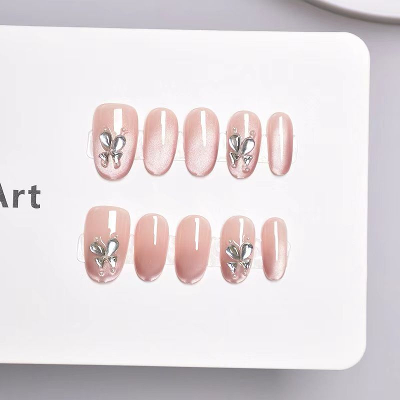Press On kynnet, jotka ovat koristeltu magneettisella Cat Eye ombrella ja kristalliperhosilla.