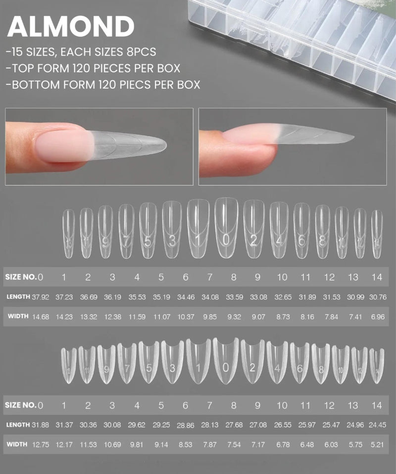 - Mittaa muotit valmiiksi. Ylämuotin tulisi olla muutaman millimetrin isompi kuin oma kyntesi ja sen peittää kynsi reunasta reunaan. Jos olet kahden koon välissä, valitse mieluummin isompi muotti.